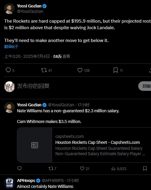 Gozalan写道:“火箭的薪资上限是1.959亿(第一土豪线),就算火箭裁掉兰代尔800万的合同他们仍超第一土豪线200万,他们还需要后续的运作才能达成所愿。补充一下,内威的合同是230万无保障,而惠特莫尔(近期处于交易流言之中)的合同是350万。”
