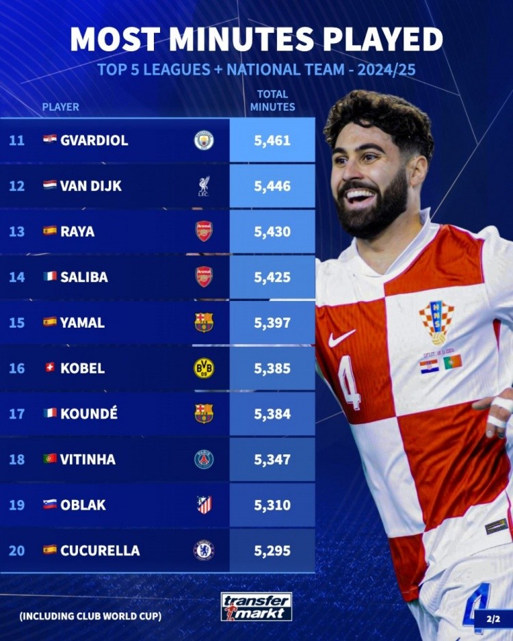7月17日讯 德国转会市场统计了五大联赛球员上赛季俱乐部+国家队的出场时间,并列出榜单,巴尔韦德居首,B费、迈尼昂二三位。