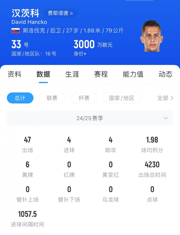 汉茨科现年27岁,司职中卫,现德转身价3000万欧。上赛季他为费耶诺德出场47次,贡献4球4助。他与费耶诺德的合同在2028年6月到期。