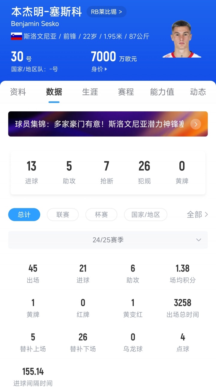 上赛季塞斯科代表莱比锡出战45场比赛,贡献21粒进球和6次助攻,西蒙斯则是33场11球7助,目前两人的德转身价都是7000万欧元。