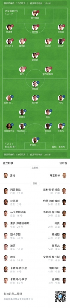 西汉姆联首发:1-赫尔曼森、29-万-比萨卡、25-托迪博、3-基尔曼、5-阿格德、12-迪乌夫、28-绍切克、8-沃德-普劳斯、10-帕奎塔、20-鲍文、11-菲尔克鲁格