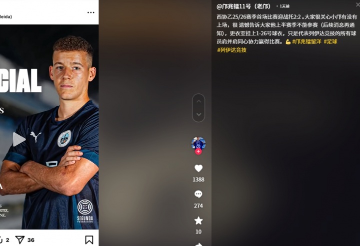 邝兆镭父亲:“西协乙25/26赛季首场比赛迎战托2:2。大家很关心小邝有没有上场,很遗憾告诉大家他上半赛季不能参赛(后续消息再通知),更衣室挂上1-26号球衣,只是代表列伊达竞技的所有球员肩并肩同心协力赢得比赛。”